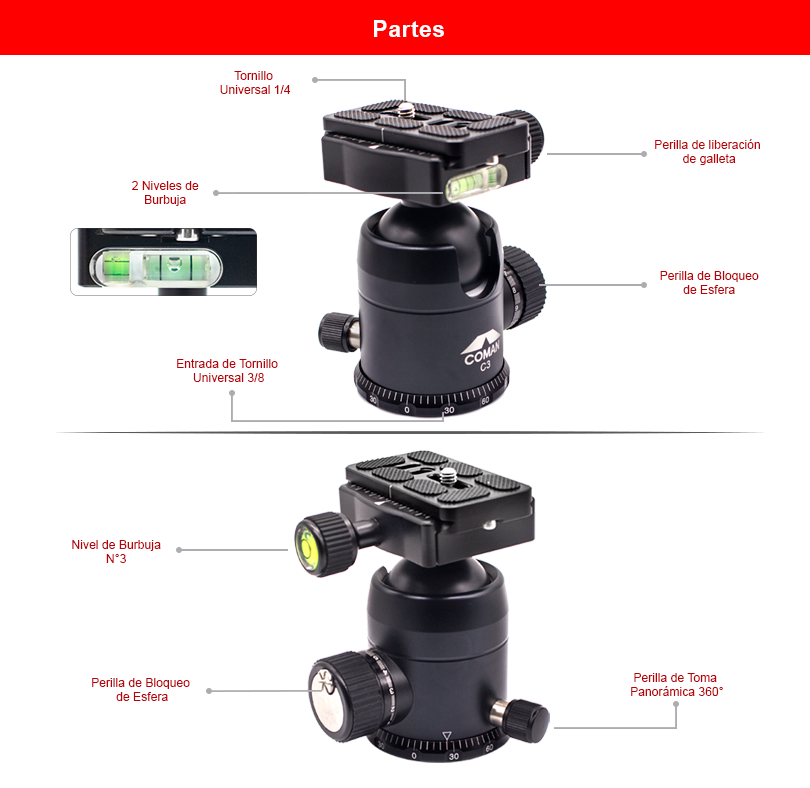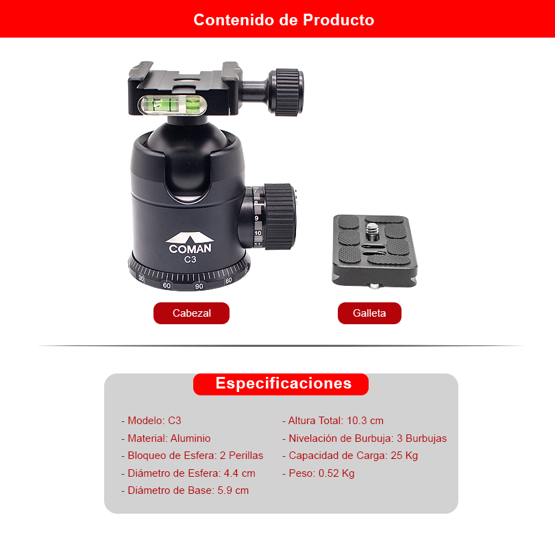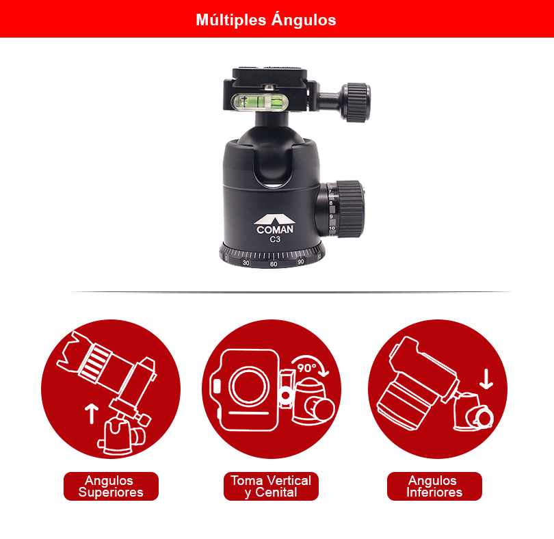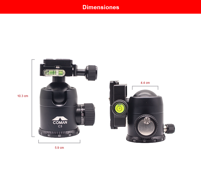 Diseñado para satisfacer las demandas de los usuarios más exigentes, el cabezal de bola C3 de Coman ofrece un rendimiento excepcional y una precisión inigualable en cada toma. Fabricado en aluminio con un acabado atractivo, este cabezal ofrece funciones avanzadas que apuntan a usuarios más experimentados y exigentes en la búsqueda de precisión y versatilidad.