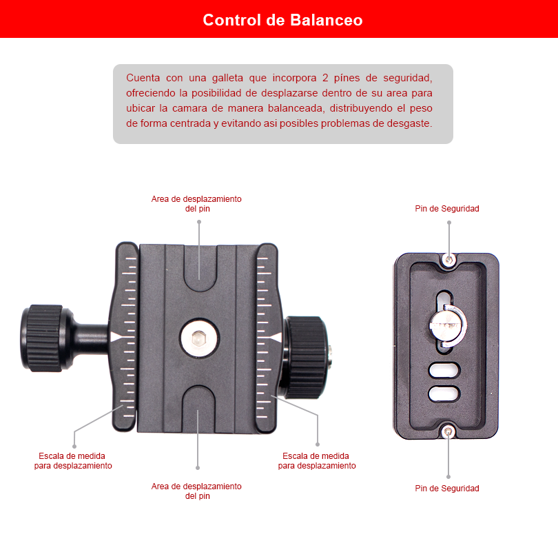 Cuenta con una galleta que incorpora 2 pines de seguridad, ofreciendo la posibilidad de desplazarse dentro de su área para ubicar la cámara de manera balanceada, distribuyendo el peso de forma centrada y evitando así posibles problemas de desgaste.