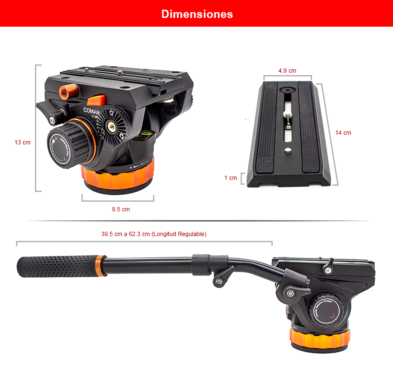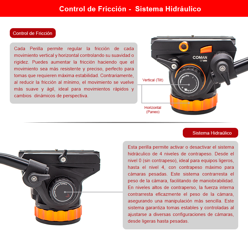 El Cabezal Q7PLUS es la opción perfecta para aquellos que trabajan con equipos pesados en el ámbito cinematográfico. Con una capacidad de carga de hasta 12 kg, su resistente construcción de aluminio lo convierte en una herramienta confiable para proyectos exigentes. Más allá de su atractivo diseño, este cabezal se destaca por su funcionalidad excepcional. Equipado con un sistema de contrapeso único de hasta 4 niveles, brinda un equilibrio preciso según el peso de la cámara, asegurando una estabilidad óptima en cada toma. Además, su control de fricción permite ajustar la suavidad del movimiento vertical, garantizando una precisión excepcional en cada captura. El Cabezal Q7PLUS, el modelo más profesional de la marca Coman, se distingue del Q7 al ofrecer también control de fricción en el movimiento horizontal, brindando un control total sobre los movimientos de la cámara. Con el Cabezal Q7PLUS, estarás preparado para enfrentar cualquier desafío audiovisual con confianza y profesionalismo.