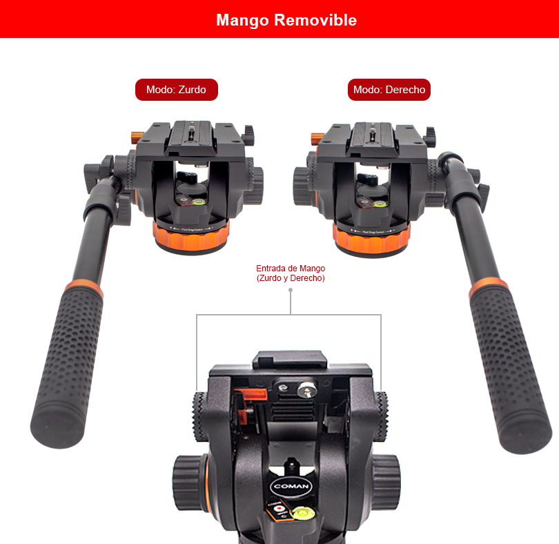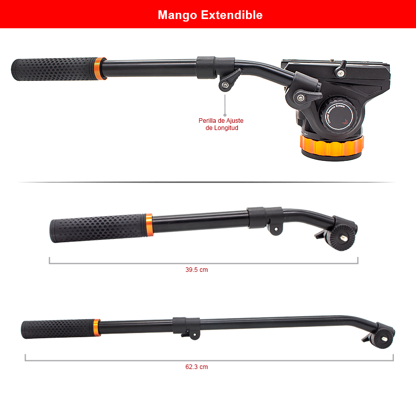 Diseñado con aluminio de alta calidad, este mango ofrece una experiencia de manejo suave y precisa. Con su capacidad para realizar movimientos fluidos tanto en horizontal (Paneo) como en vertical (Tilt), el mango largo te brinda total libertad creativa en tus tomas. Además, su diseño adaptable permite cambiar de lugar el mango para satisfacer las preferencias de diestros y zurdos, ofreciendo comodidad sin igual en cualquier posición. Además, el mango es plegable y se puede extender desde los 39.5 cm hasta 62.3 cm, lo que te permite adaptarlo según las necesidades de tu equipo, especialmente cuando trabajas con equipos más grandes que requieren un mango más largo para mayor comodidad.