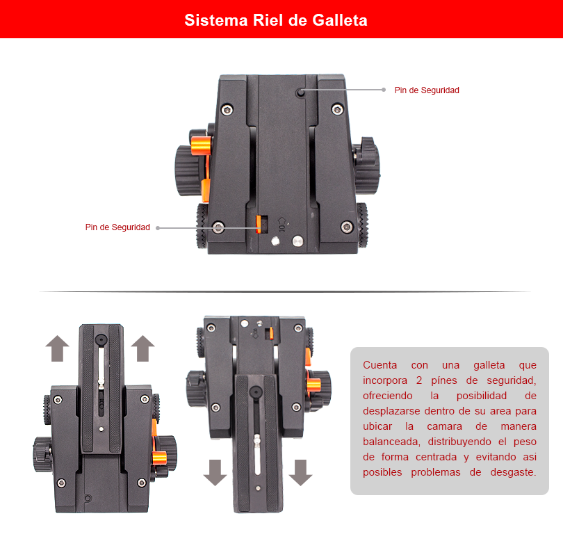 El cabezal está equipado con una galleta tipo riel que ofrece estabilidad y un centrado del peso de la cámara, lo que resulta en una mejora significativa en la calidad de tus producciones audiovisuales. Este sistema permite desplazar la cámara hacia adelante o hacia atrás para equilibrar su peso, lo que garantiza una mayor estabilidad y facilita la realización de tomas más fluidas y precisas. Además, la galleta tipo riel protege el cabezal del desgaste, asegurando la durabilidad y el rendimiento óptimo de tu equipo a lo largo del tiempo.