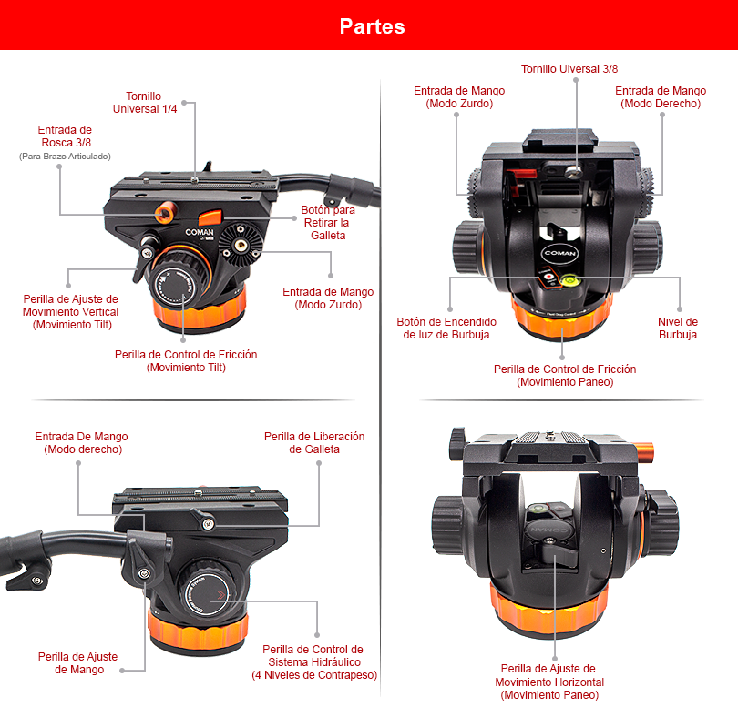 El cabezal está diseñado con un sistema innovador que permite controlar no solo la fricción del movimiento vertical (Tilt) sino también del movimiento horizontal (Paneo). Con esta función, puedes ajustar la perilla para incrementar la fricción interna, lo que aumenta la dureza del movimiento y proporciona una mayor precisión en las tomas. Ideal para trabajos que requieren una gran precisión, este control de fricción garantiza movimientos suaves y controlados. Por otro lado, si necesitas movimientos más fluidos y rápidos, puedes desajustar la perilla para eliminar la fricción interna, lo que permite una operación más suave y ágil del cabezal. Esta característica es especialmente útil para capturar tomas rápidas y dinámicas en situaciones donde se requiere una respuesta rápida y precisa del equipo.