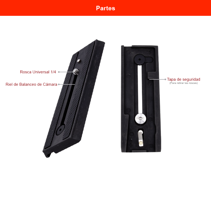 La placa incorpora una rosca universal 1/4, utilizada en la mayoría de cámaras DSLR, mirrorless y cámaras de video.