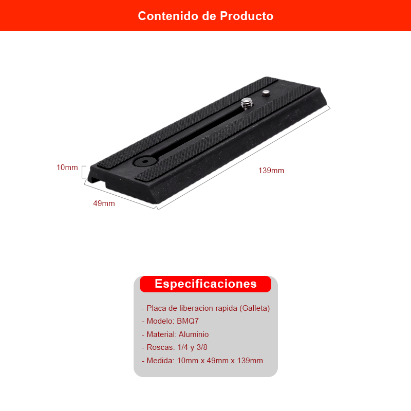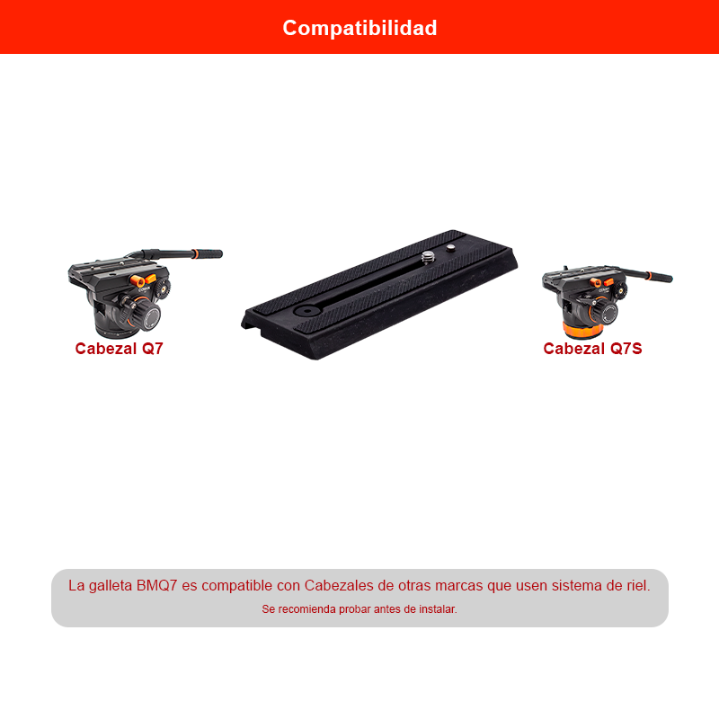 La Galleta COMAN BMQ7 es una placa de liberación rápida diseñada para facilitar el montaje y desmontaje de cámaras en cabezales de video profesionales. Gracias a su diseño tipo riel, permite ajustar la posición de la cámara para lograr un balance perfecto durante la grabación.