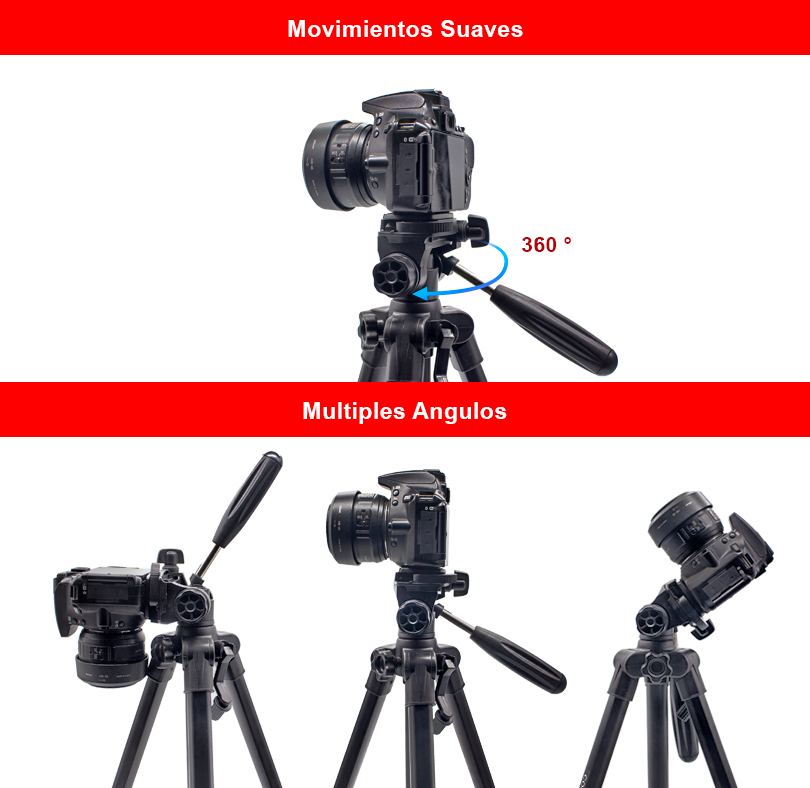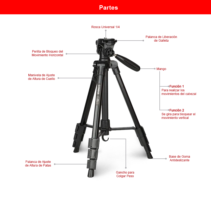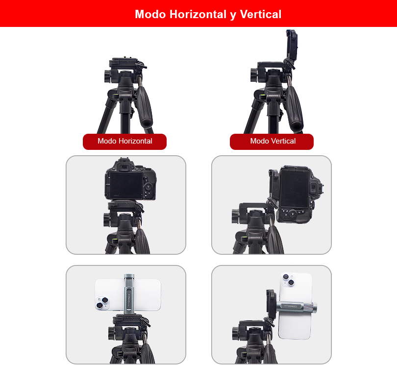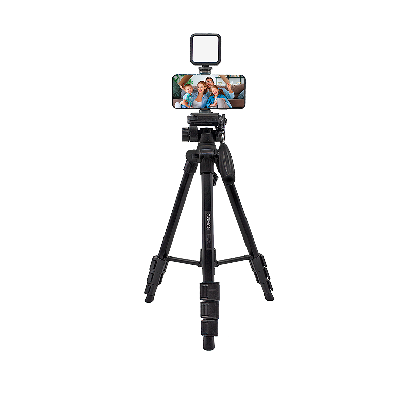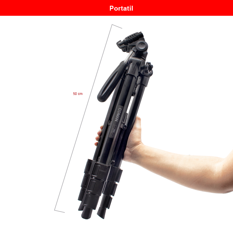El kit incluye el popular trípode Coman E800, la opción preferida para la grabación de contenido gracias a su peso ligero de 1.35 kg y su tamaño compacto de 50 cm cuando está plegado. Además, alcanza una altura máxima de 143 cm, facilitando su transporte y permitiendo realizar grabaciones en cualquier lugar. Además, su construcción en aluminio con un acabado atractivo lo convierte en una herramienta ideal para cualquier entorno. Una de sus mayores ventajas es su cabezal, que ofrece un movimiento muy suave, permitiendo realizar grabaciones profesionales con transiciones más sutiles y controladas sin interrupciones.
