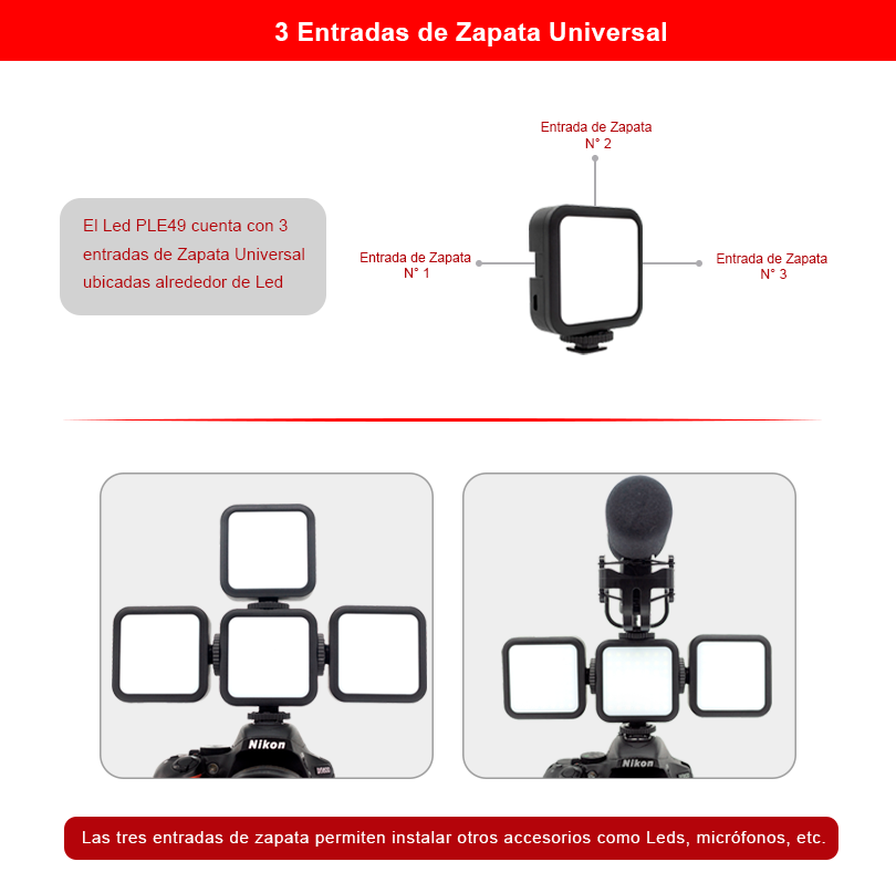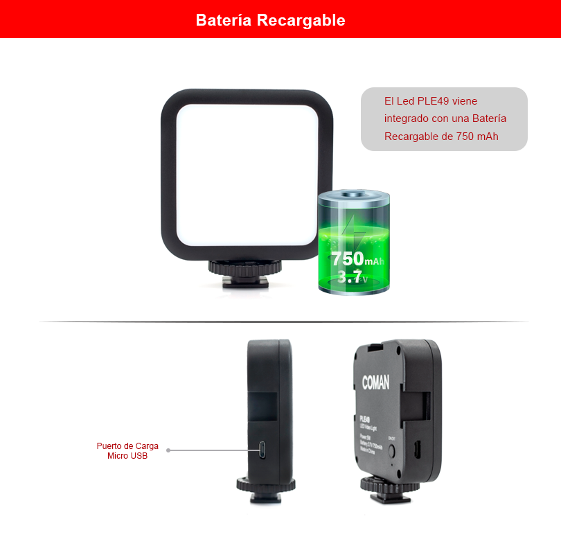 El kit incluye la luz LED Coman PLE49, equipada con 49 focos de luz fría para capturar grabaciones nítidas y claras. Esta luz LED ofrece la opción de ajustar la intensidad del brillo en tres niveles: 30%, 60% y 100%. Además, cuenta con una batería recargable que facilita su uso tanto en interiores como en exteriores. Con un CRI de 95, garantiza una calidad de iluminación superior en comparación con otras marcas. Además, esta luz LED tiene opciones de montaje universales, lo que permite usarla en diferentes soportes como parantes, trípodes o incluso encima de cámaras profesionales con zapata universal.