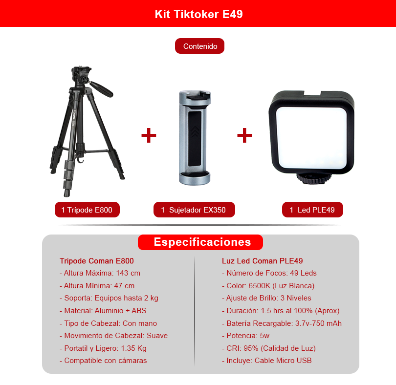 Ideal para principiantes en TikTok, este kit te brinda todo lo que necesitas para iniciar tu aventura de creación de contenido. Incluye una luz LED Coman PLE49, que viene con 49 LEDs de luz blanca, que se puede ajustar en tres niveles de brillo (30%, 60%, 100%). Su tamaño compacto y su batería recargable la hacen ideal para grabaciones tanto en interiores como en exteriores. Además, el kit cuenta con un CRI del 95%, garantizando una calidad de luz superior para tus videos.