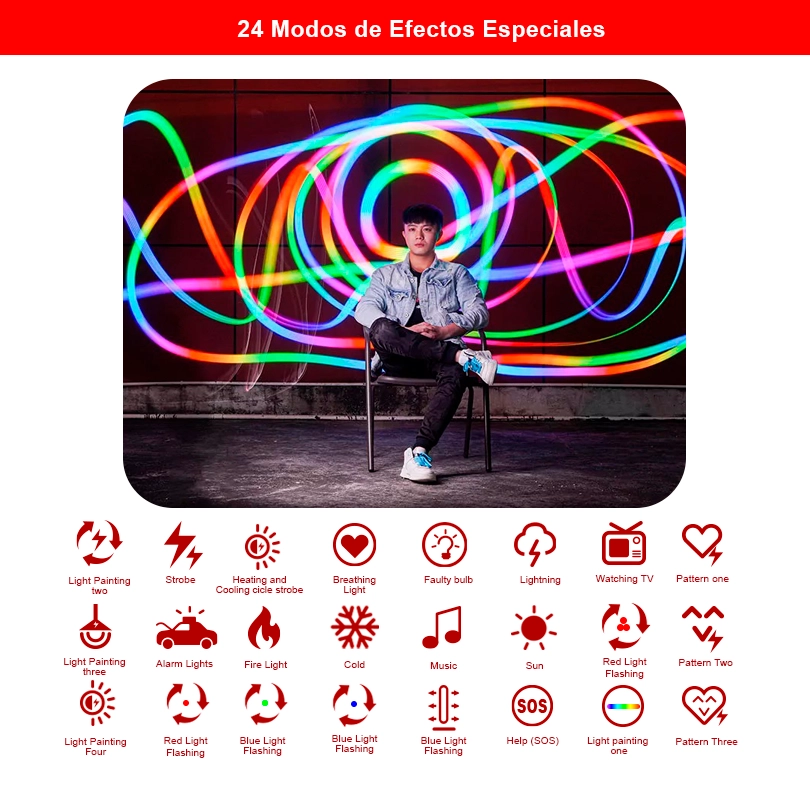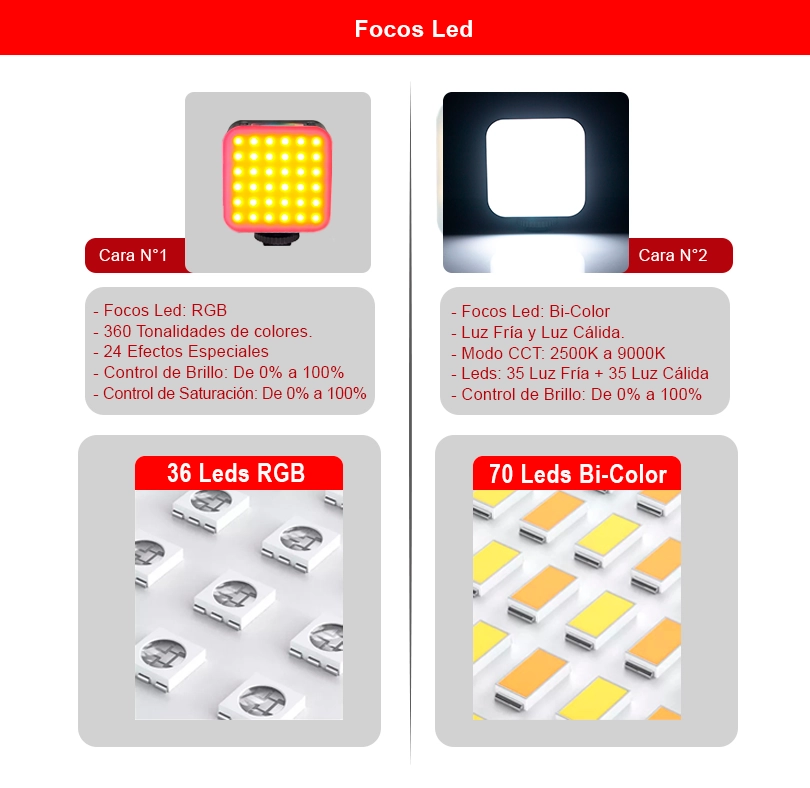 Sumérgete en un mundo de posibilidades visuales con los 24 efectos especiales del Led PLE59. La combinación de sus 36 Leds RGB y 70 leds Bi-Color desencadena la magia detrás de cada escena, creando una experiencia visual dinámica y vibrante. Al fusionar estos elementos, podrás dar vida a escenas llenas de color y realismo en tus videos. Desde las luces de la policía hasta el parpadeo de un televisor encendido, este LED te permite recrear situaciones vívidas que añaden autenticidad y dinamismo a tus producciones.