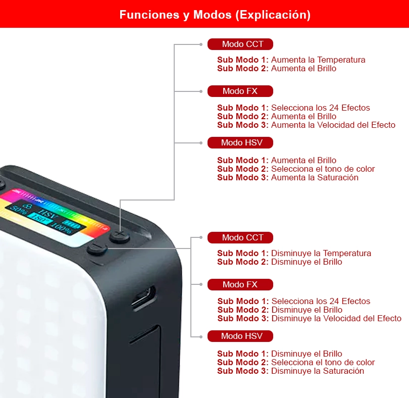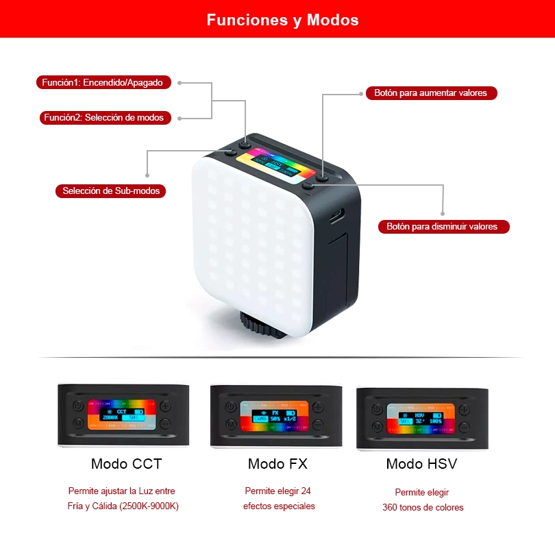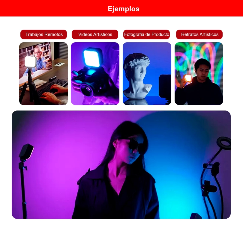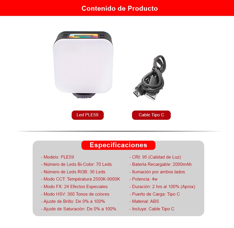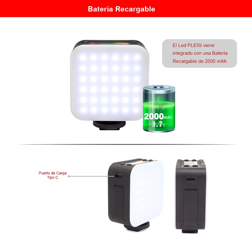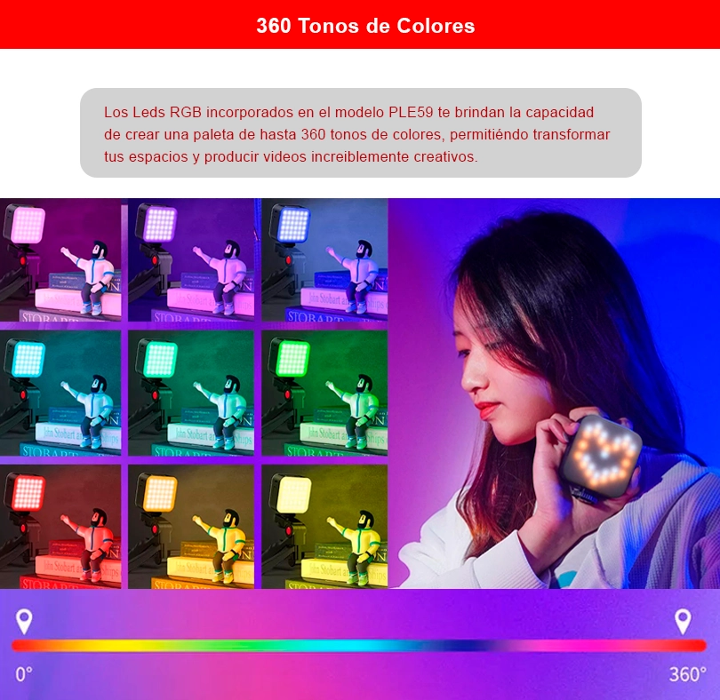 Con su combinación única de iluminación RGB, ofreciendo hasta 360 tonos de colores, y focos Leds Bi-color que emiten luz fría y cálida, este dispositivo es la elección perfecta para proyectos que requieren una amplia gama de tonalidades. Destinado a aquellos que buscan dar vida y profundidad visual a sus contenidos, el PLE59 es una herramienta imprescindible para la creación de vídeos y fotografías vibrantes. Además, con sus 24 modos de efectos especiales, podrás recrear escenas divertidas desde las luces de ambulancia, policía, televisión encendida, entre otros, añadiendo un toque único y envolvente a cada producción visual.