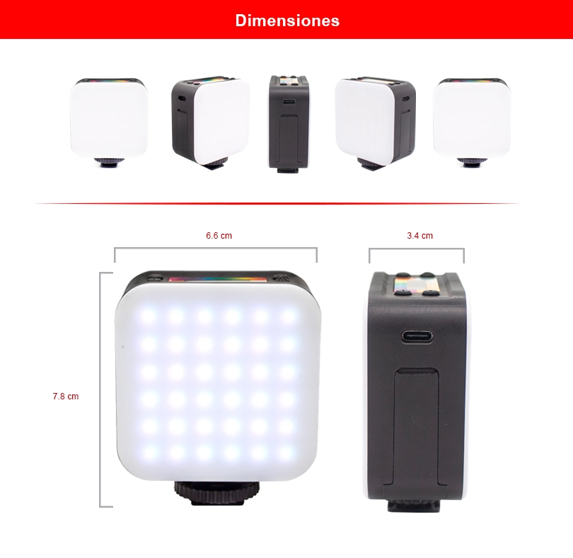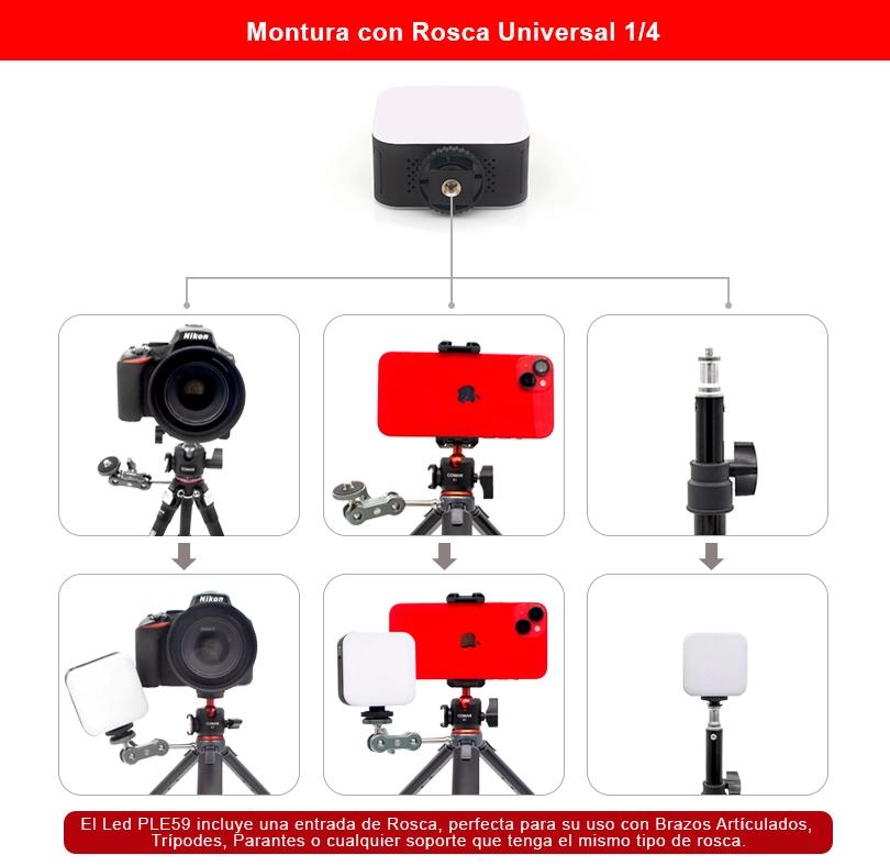 Está equipada con 1 entrada de rosca universal 1/4, lo que te brinda la posibilidad de montarla en soportes como trípodes, parantes y brazo articulados. Esta característica te permite ajustar la luz LED en diferentes ángulos y explorar tomas creativas desde diversas perspectivas. Con esta flexibilidad de montaje, puedes llevar tu iluminación al siguiente nivel y lograr resultados únicos en tus proyectos audiovisuales.