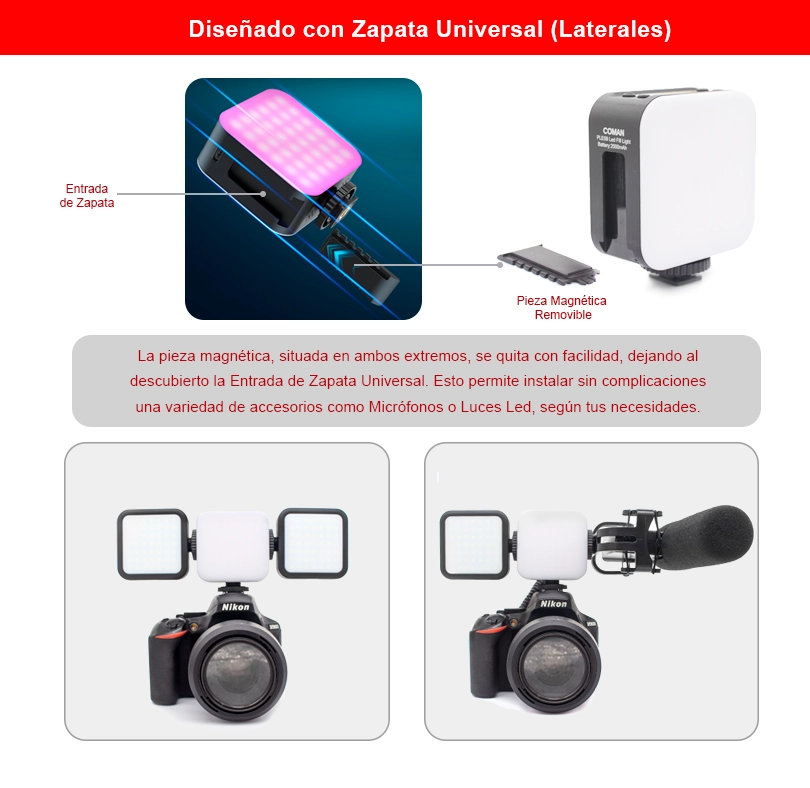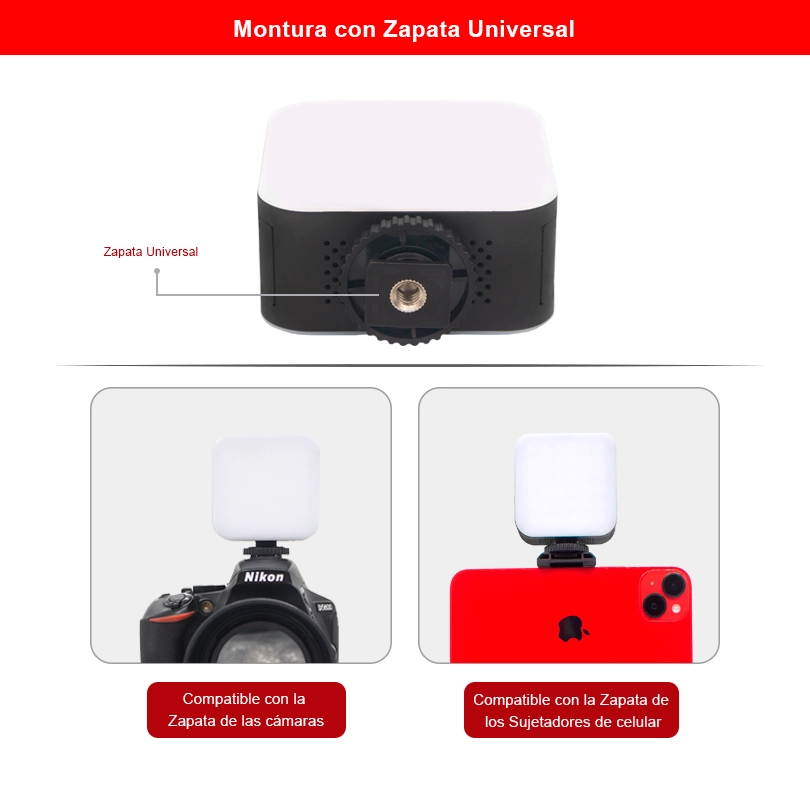 Gracias a su montaje a través de la Zapata Universal, es perfecta para cámaras y teléfonos móviles. Puedes acoplarla fácilmente en la parte superior de tu cámara, ya que la mayoría de las cámaras modernas cuentan con esta entrada. También es compatible con sujetadores para teléfonos que tienen esta misma entrada de zapata universal.