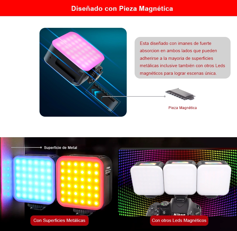 El Led PLE59 está equipado con dos piezas magnéticas, estratégicamente colocadas en cada uno de sus lados. Esta innovadora característica te ofrece la libertad de posicionar el led en lugares complejos, ideal para embellecer tus espacios de grabación y aportar una iluminación lúdica a tus fondos. La versatilidad de estas piezas magnéticas permite que el led se adhiera a superficies metálicas, brindándote la flexibilidad de iluminar desde ubicaciones inusuales. Esto marca una diferencia significativa con respecto a los leds convencionales de otras marcas, ya que no requiere un soporte adicional para su instalación. Además, estas piezas magnéticas posibilitan la incorporación de más leds a los costados, amplificando la potencia lumínica, ideal para trabajos que demandan una mayor intensidad lumínica.
