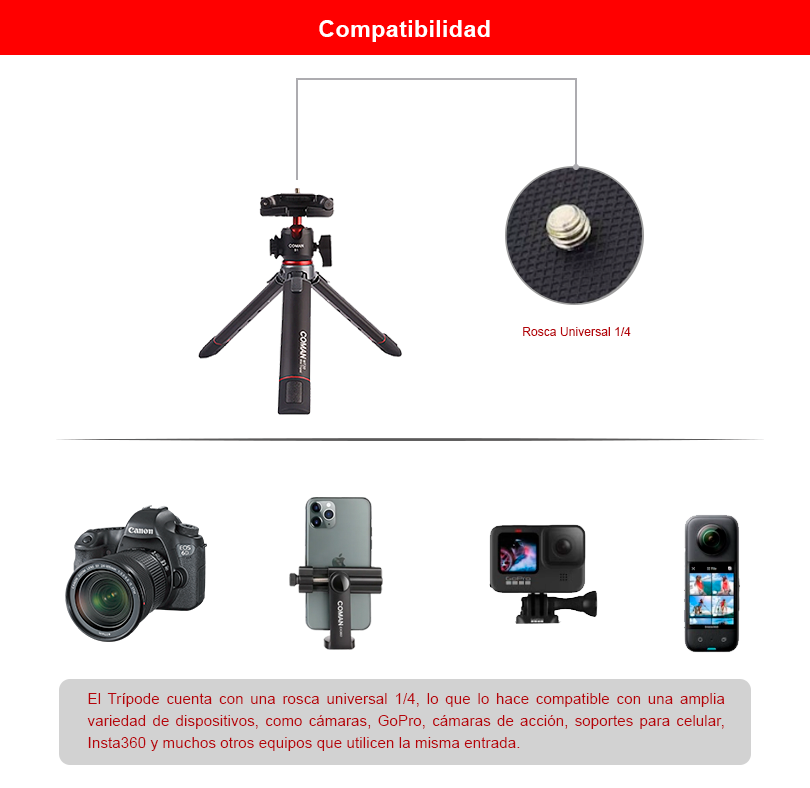 La Rosca Universal 1/4 presente en los Trípodes de Mesa COMAN también es compatible con otros equipos pequeños que tengan esa entrada, como Cámara, Filmadora, Web Cam, GoPro y Cámara de Acción, lo que amplía aún más las posibilidades de uso del trípode.
