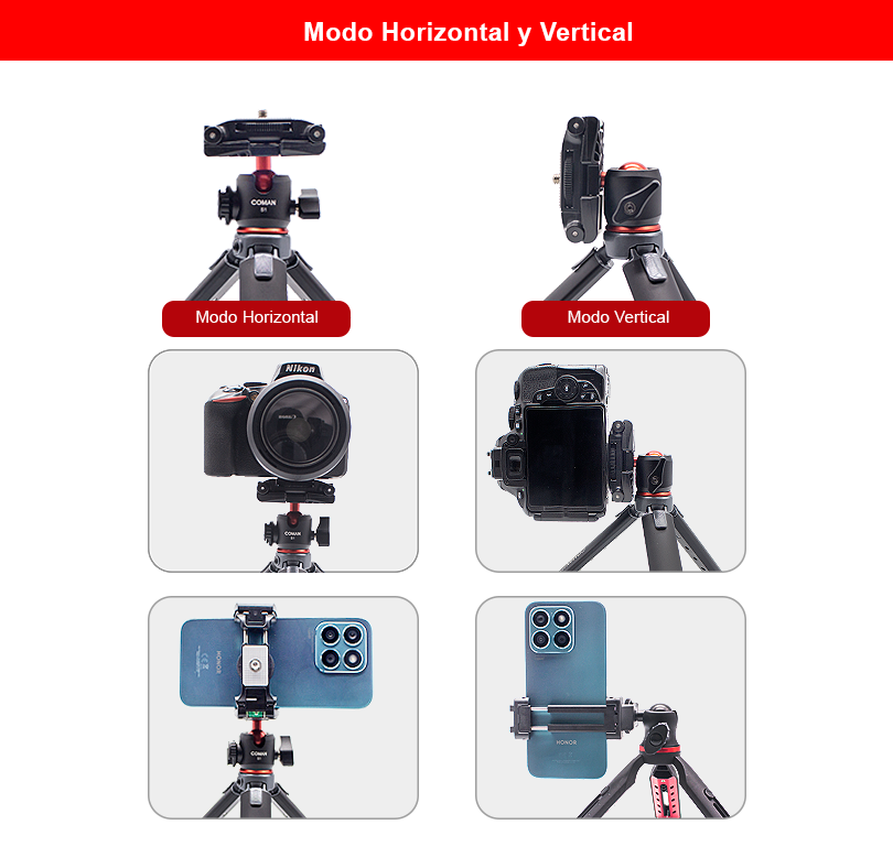 El Coman MT20S1 es muy versátil y te permite utilizar tu equipo tanto en modo horizontal como vertical, lo que es especialmente útil para adaptarse a las diferentes plataformas de redes sociales y formatos de contenido. Por ejemplo, puedes usar el modo horizontal para grabar videos en formato widescreen para YouTube, mientras que el modo vertical es perfecto para videos de Instagram, Facebook, TikTok o WhatsApp. Además, el cabezal del trípode también es ajustable en diferentes ángulos para que puedas obtener el encuadre perfecto en cada situación.