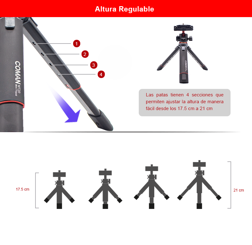 El Trípode de mesa Coman MT20S1 es un modelo de alta gama que destaca por su diseño moderno y la amplia variedad de funciones adicionales que ofrece en comparación con otros modelos. Fabricado en aluminio de alta densidad tanto en sus patas como en su cabezal, este trípode no solo es adecuado para el uso con celulares, sino que también puede soportar cámaras de mayor peso.
