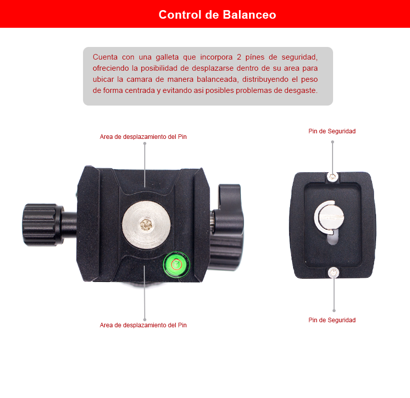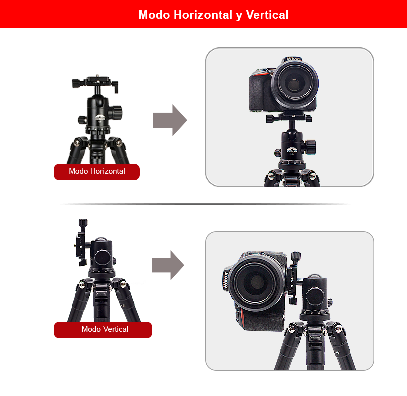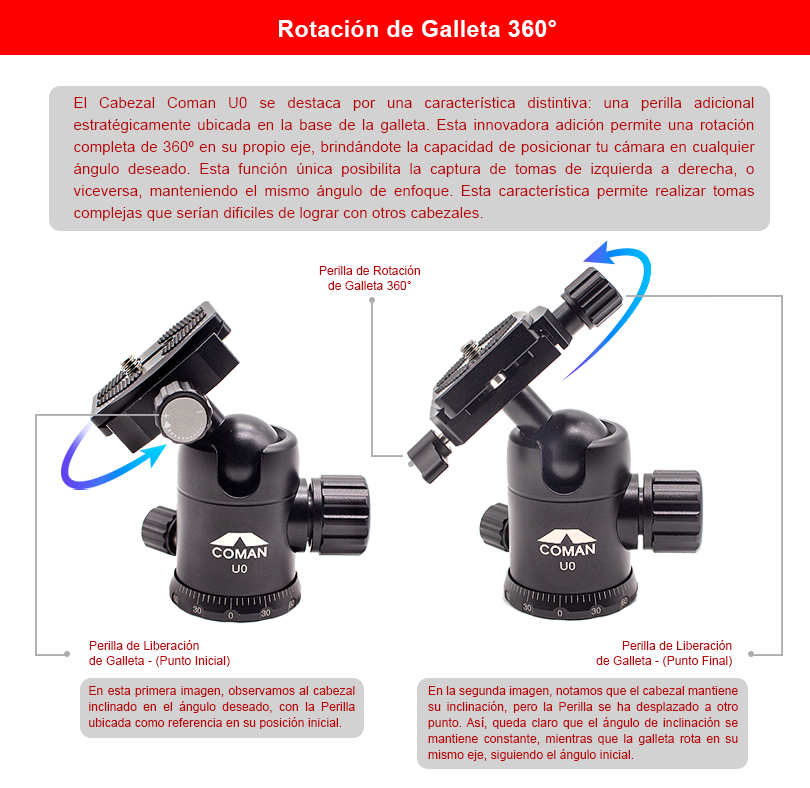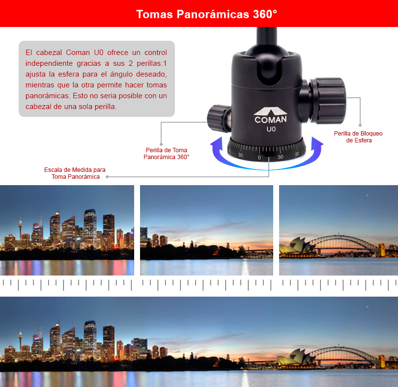 El Trípode Coman MT70 viene equipado con un cabezal de 2 perillas en la esfera, lo que lo convierte en un verdadero trípode profesional. A diferencia de los trípodes con una sola perilla, este modelo permite realizar tomas panorámicas con una precisión y estabilidad inigualables. Con 1 perilla, se puede ajustar el ángulo deseado para un encuadre perfecto, mientras que la otra perilla permite realizar un paneo constante para lograr una imagen panorámica perfecta. Por esta razón, es el complemento ideal para fotografiar paisajes, grupos de personas o cualquier otra toma que requiera una perspectiva más amplia.