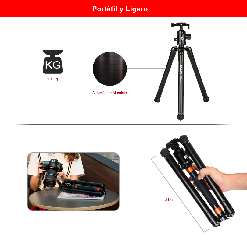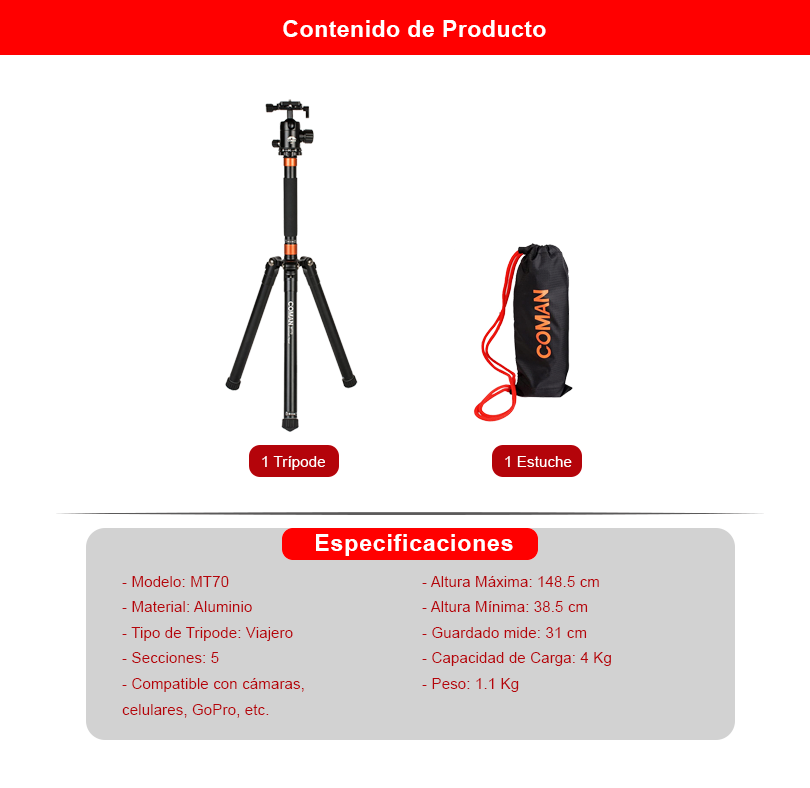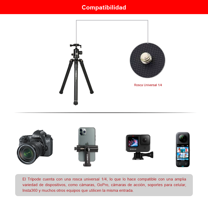 La Rosca Universal 1/4 presente en los Trípodes Coman también es compatible con otros equipos pequeños que tengan esa entrada, como Cámara, Filmadora, Web Cam, GoPro y Cámara de Acción, lo que amplía aún más las posibilidades de uso del trípode.